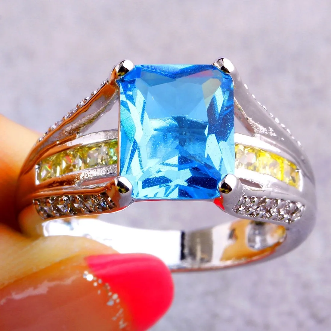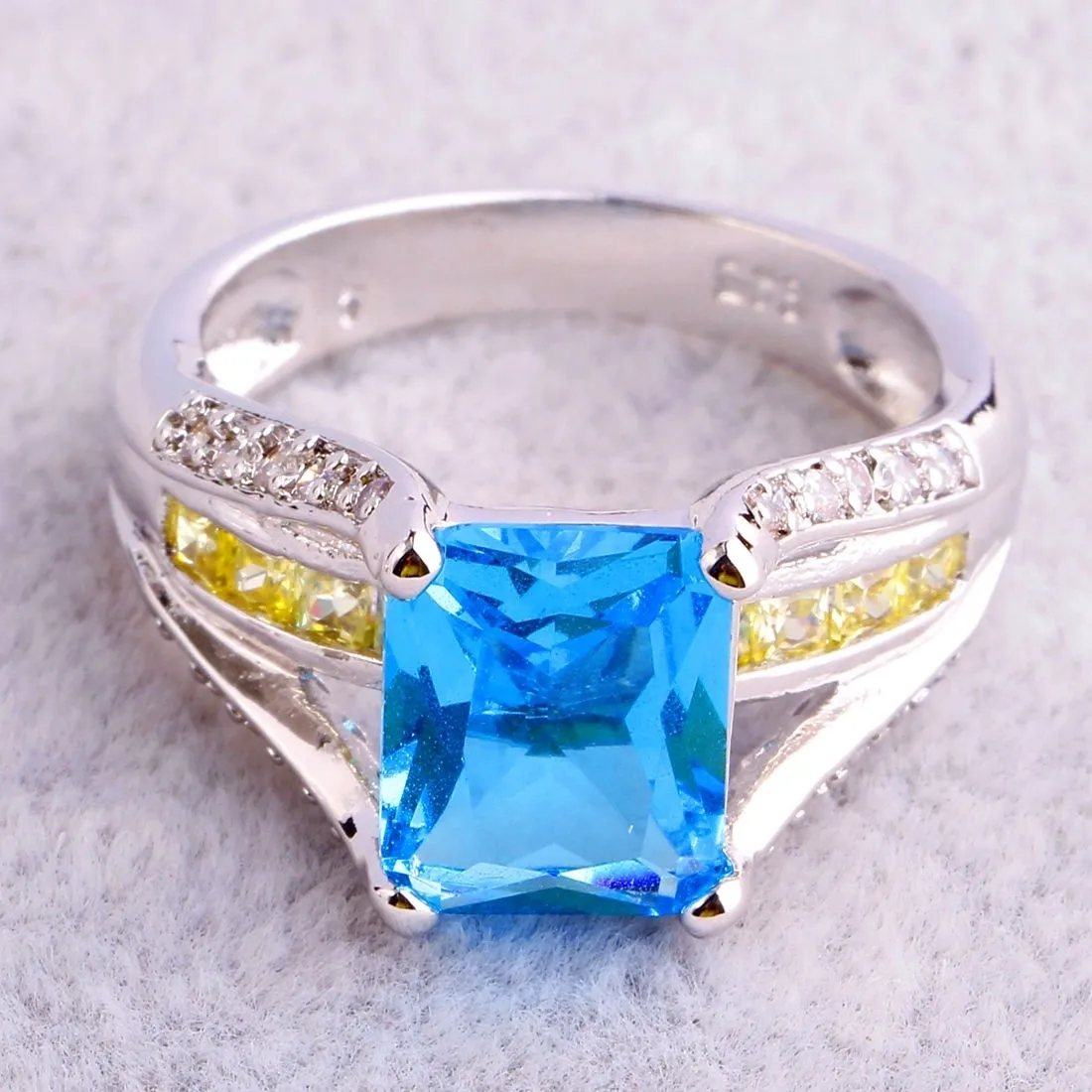 Emerald & Round Cut Blue & White Topaz Citrine Gemstone Silver Ring Size 7 Item specifics Condition: New without tags:  A brand-new, unused, and unworn item (including handmade items).  Material: Stone Style: Fashion Main Stone: Blue Topaz Ring Size: 7 Main Stone Shape: Emerald Metal: Silver Main Color: Blue UPC: Does not apply
